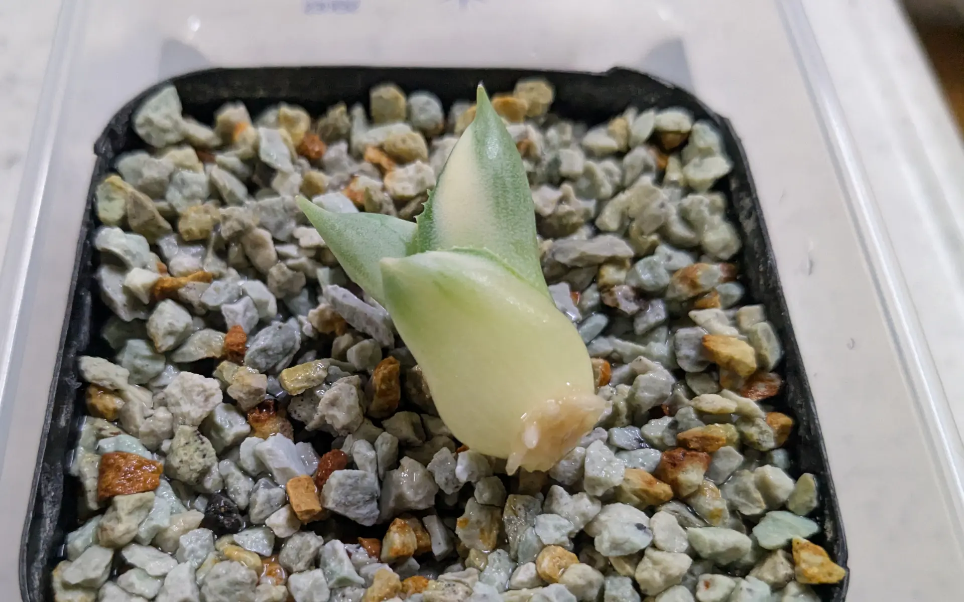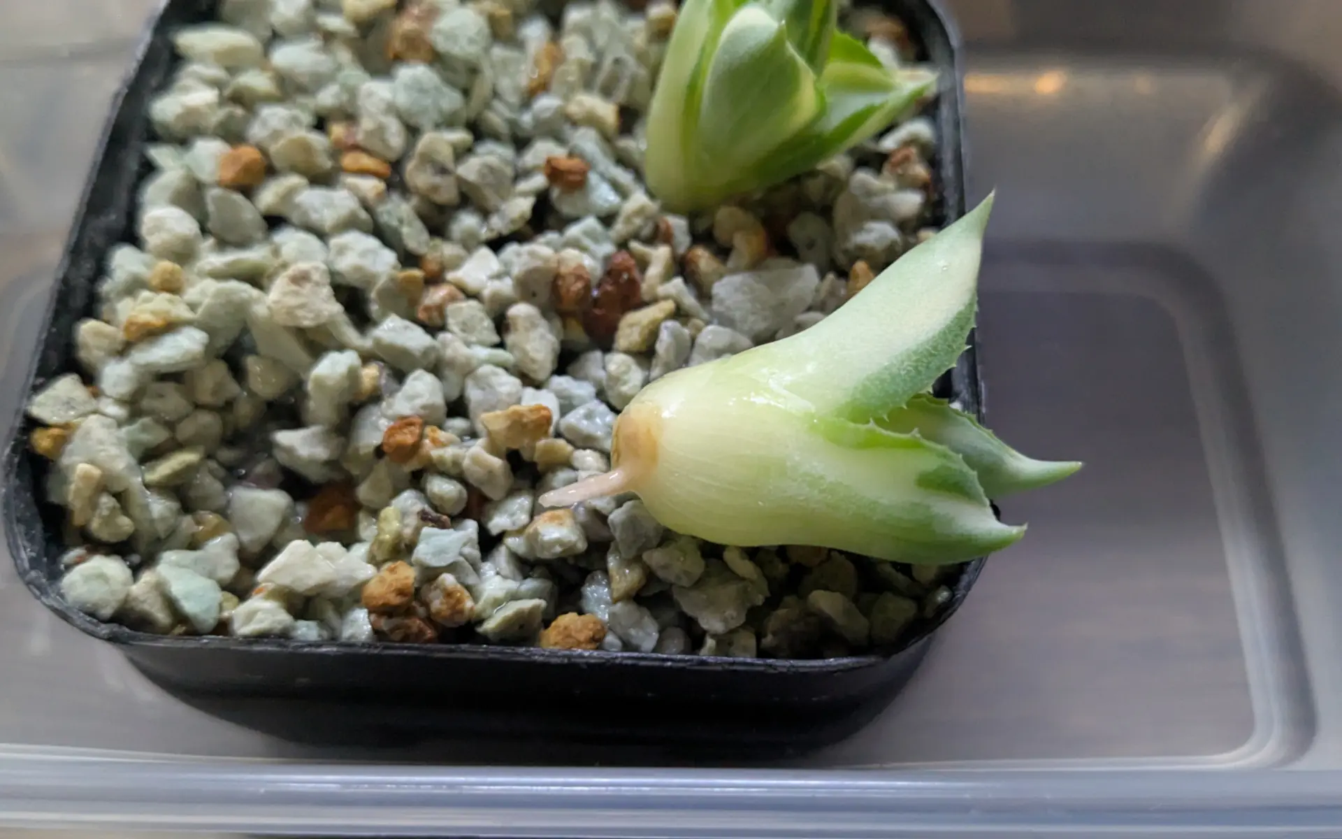 この記事で採取した、王妃雷神錦の子株を発根管理した。